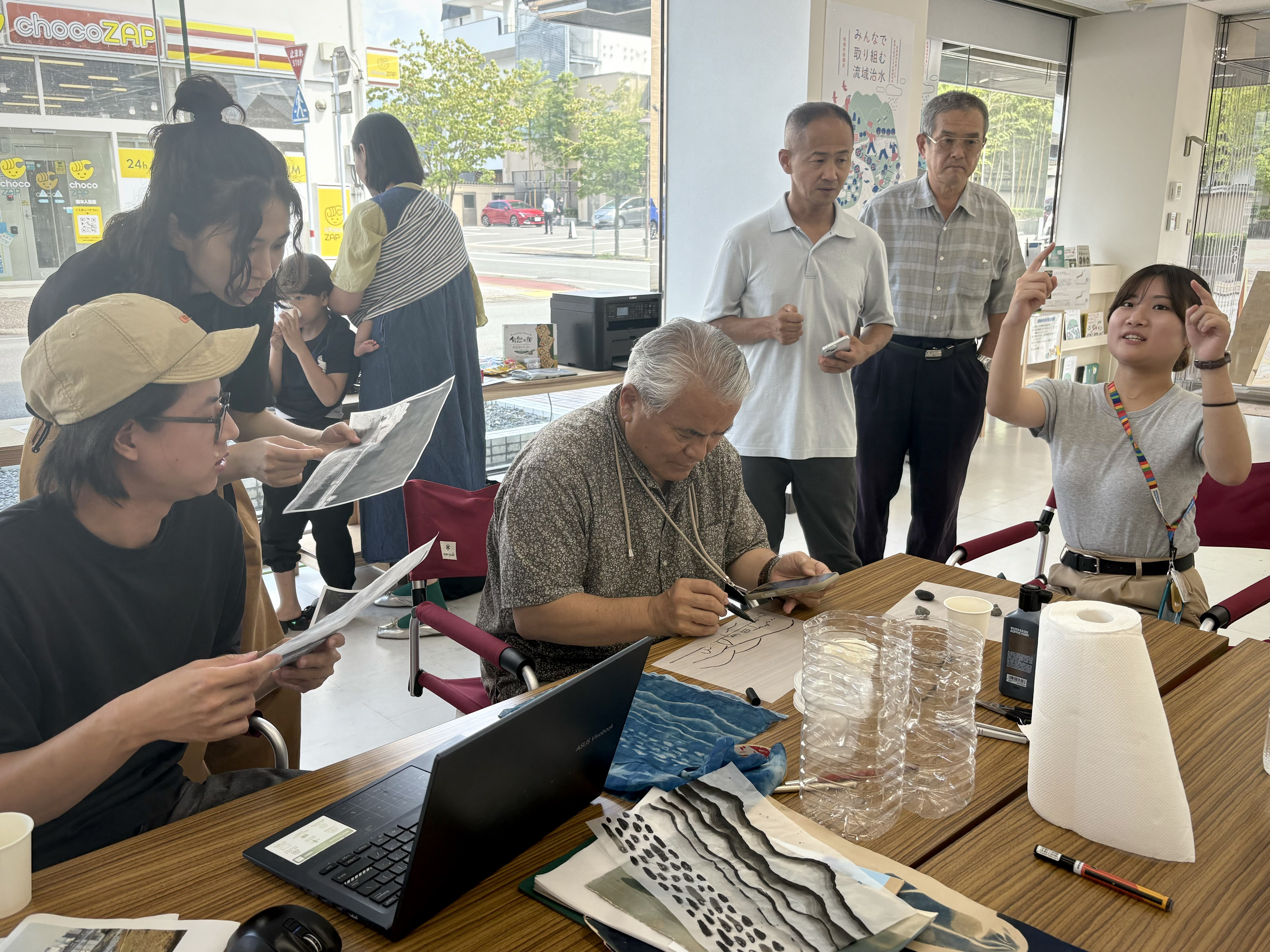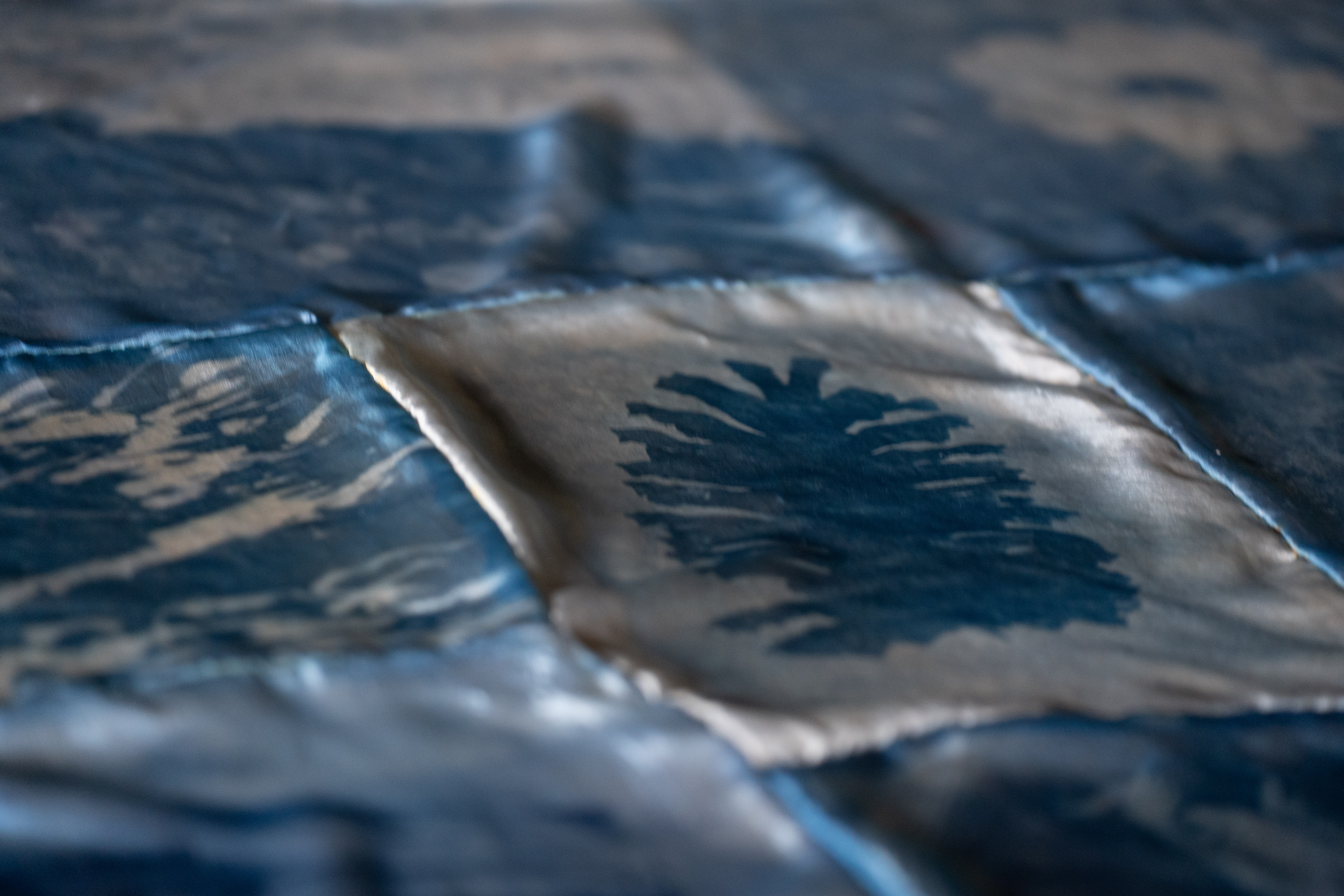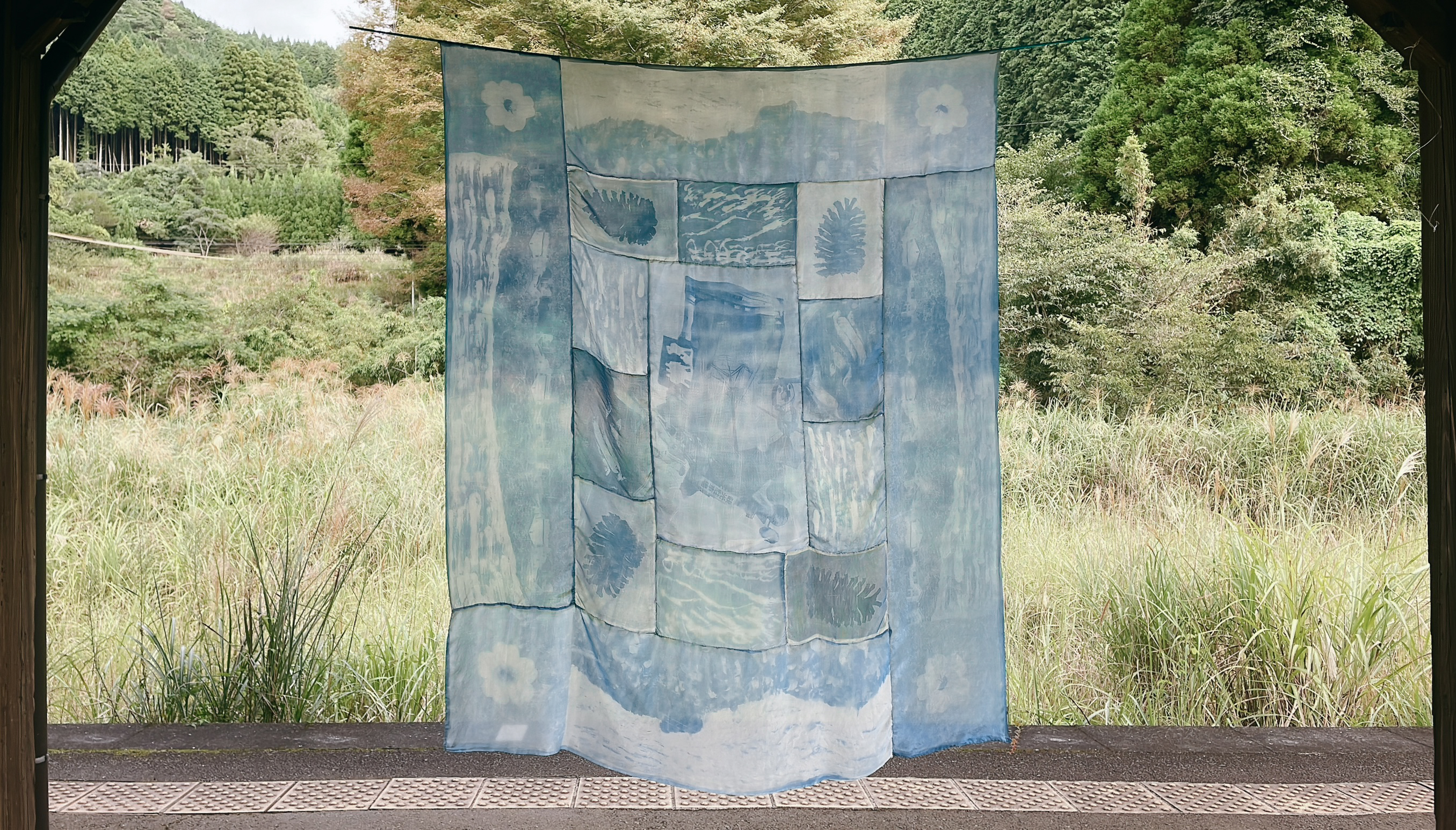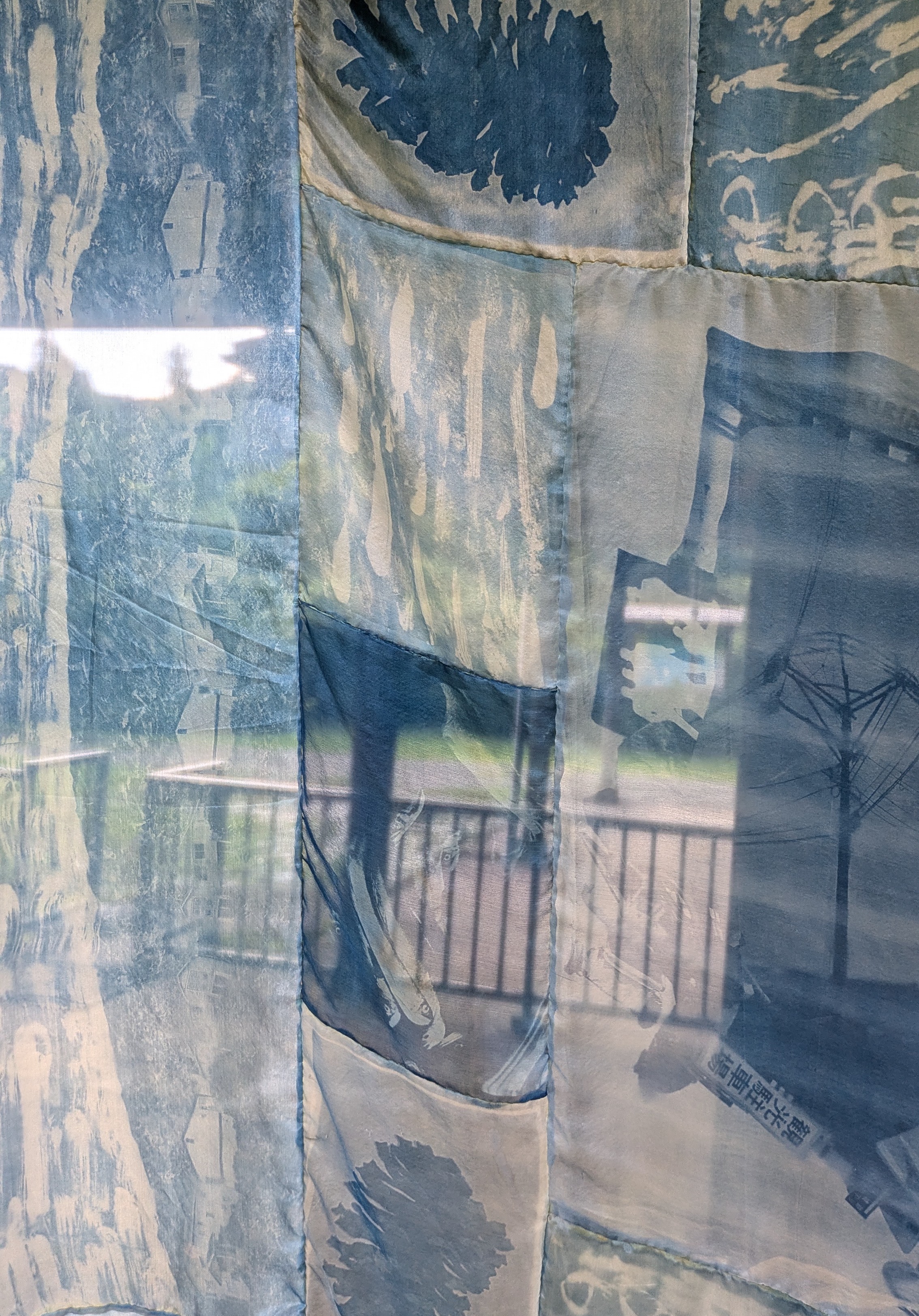 On the fifth anniversary of the 2020 flood disaster in Kumamoto, I spent nearly two months in residence in the Yatake mountain area of Hitoyoshi. During this time, I collaborated with local residents on a community art project that combined oral history with visual collage. In the workshops, participants shared personal observations of the Kumagawa landscape through photographs, drawings, and stories. Using the cyanotype process, I developed these precious images onto delicate silk fabric pieces, then sewed them together with the pattern arrangement inspired from Tatami in the residence.